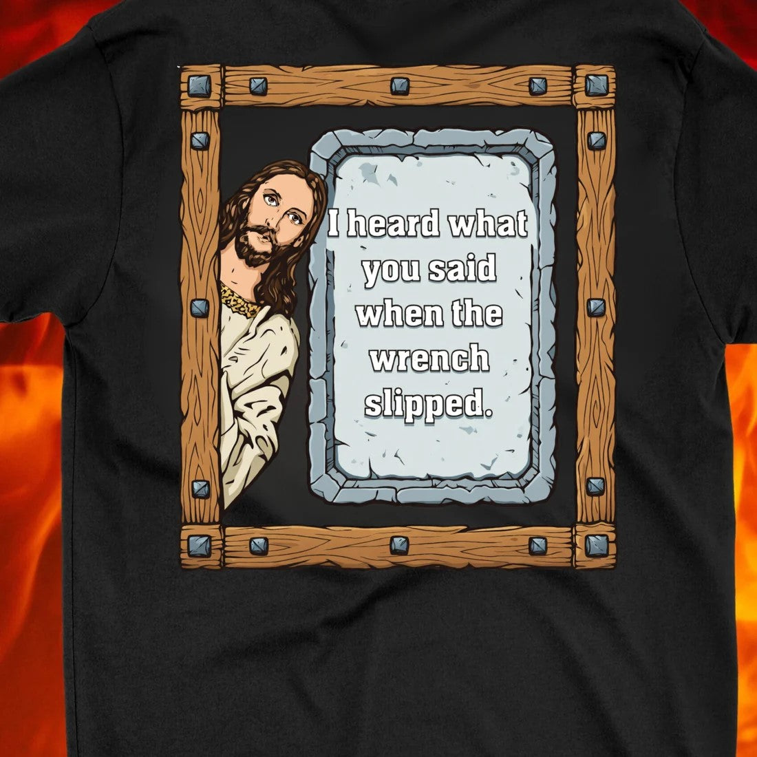 A must-have for anyone who’s ever busted a knuckle in the garage. This tee combines classic wrench-turning frustration with a little divine humor.